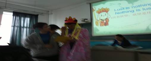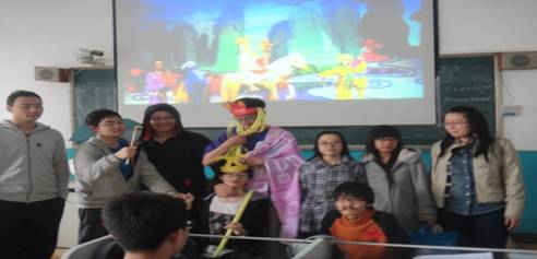 2011级经济管理公司会计1班王宁、田昊、于洋等同学于2012年4月19日英语课上进行了英语话剧表演——“新三打白骨精”,取得了很好的效果。员工精心改编了经典片段“三打白骨精”,加入了斗地主、流行语等现代因素,并制作了幻灯片,还加入了现代音乐、西游记的主题曲等等。演员精心编排了武打动作,丰富了故事情节,自制的道具使整个话剧更加形象生动。整个话剧诙谐幽默,演员的表演十分到位,使同学们在开怀大笑的同时也练习了英语口语和听力,也使演员们增强了英语表达的自信并提高了表演才能。这次英语话剧演出对于员工来说是一个很好的锻炼机会,使他们意识到学习英语不只是为了应付考试,更重要的是应用实际交际中,从一点一滴学习英语、练习英语,才能实现学英语的真正目的。