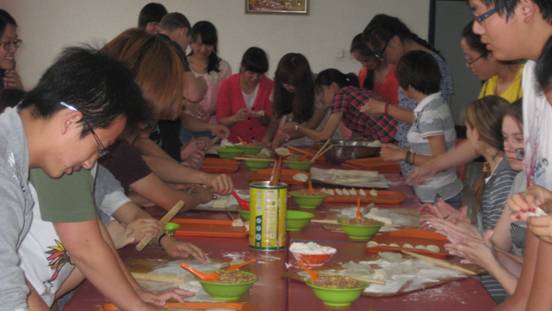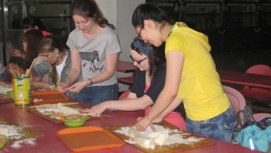 首先,外国职工展示并介绍了具有本国特色的点心并请在场同学们品尝。随后,进入到具有中国特色的包饺子环节,职工和本国员工通过报数形式结为3组进行比赛,哪组包的又快又好则获胜,获胜小组会获得奖励。而且在过程中主持人对各个小组进行5道小知识竞答(关于各国饮食文化),采取抢答形式,并对答对者发送小礼品。然后,主持人利用煮饺子的等待时间介绍了饺子的相关文化。介绍完之后,猜单词游戏环节开始,原定三组,各组选出一位拿道具的人,配合主持人。同时每组再选出一名猜词者,并由组员为猜词者比划,在规定时间内答对题目最多的小组为获胜方并被授予奖品。游戏题目涉及日常生活用品、水果蔬菜、明星姓名及地名等。当游戏进行差不多时,下了锅的饺子也熟了,并被一盘盘端上了餐桌。望着香喷喷但形状各异的饺子,大家不禁为自己的“作品”忍俊不禁。最后,同学们与职工合影留念。