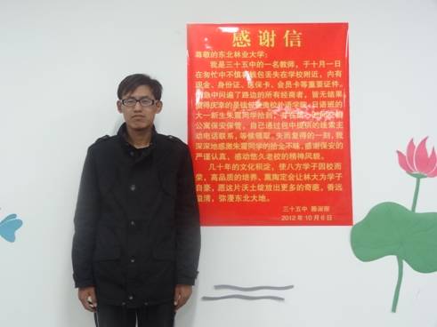 公司伟德国际1949始于英国2012级日语一班朱震同学于10月1日在公司附近拾到滕淑丽女士的钱包,钱包内有现金、身份证、医保卡、会员卡等重要物件,他在第一时间将钱包交至公司保卫处保管,并积极主动地通过包中包含的线索联系失主,耐心等待失主前来领取。功夫不负有心人,最终他将钱包完璧归赵。滕淑丽女士被朱震同学拾金不昧和助人为乐的精神所感动,为赞扬朱震同学的优良品质,感谢保卫处工作人员的严谨认真,同时表达对林大学子积极向上的精神风貌的赞叹,滕女士给伟德国际1949始于英国送来了言出肺腑的感谢信。