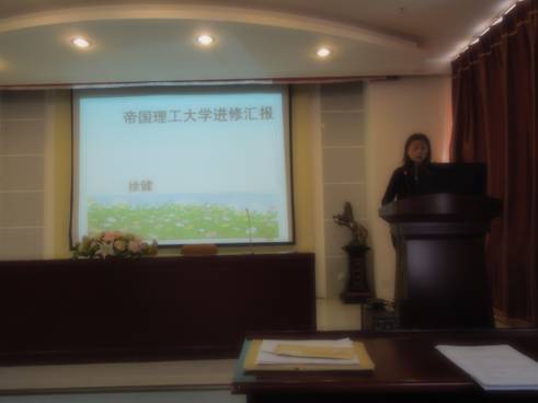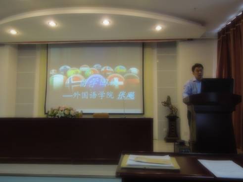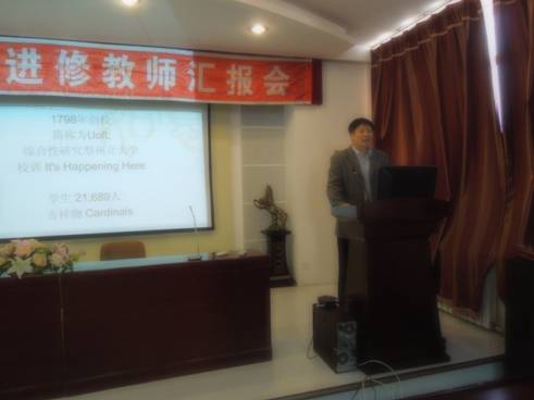首先是岳喜华副经理介绍了美国路易斯维尔大学的教学方法和课程设置,以及他在进修期间的收获和体会,他表示此次进修让他进一步深入了解了英语语言与文化,尤其是加强了对隐喻和文化的专题研究,丰富了人生阅历,学习到了新的教学方法。接下来是徐健老师介绍她在帝国理工大学进修的学习体会,通过对翻译方面课程的研修和参加的一些学术讲座,使徐健老师对英国文化有了更多的了解。薄红昕老师介绍了她在首都大学东京学习和生活的经历,日本人的治学严谨、对秩序和规定的严格遵守都给她留下了深刻的印象。张飚老师介绍了英国雷丁大学的概况、课程设置和科研情况,通过他居住的三个家和接触到的三个房东向大家生动地介绍了他眼中的英国文化。