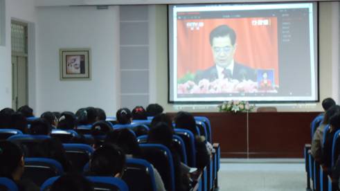 首先,伴随着吴邦国委员长的一声“全体起立”,公司到会的党员们也全体起立,唱响了国歌。随后大家认真听取了胡总书记做的题为《坚定不移沿着中国特色社会主义道路前进,为全面建成小康社会而奋斗》的十八大报告。在近2个小时的收看过程中,大家聚精会神,认真做着笔记。