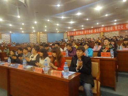 活动正式开始前,工作人员为观众分发感恩卡片,请观众写感恩寄语。一段激情洋溢的开场舞过后,活动正式拉开了帷幕。接下来的节目是相声《我这半辈子》,它描述了从中学跨入大学的美好,同学们表演得幽默诙谐,博得台下观众的阵阵掌声。同学们带来的热舞《Cry Cry 》让我们感受到了蓬勃向上的青春魅力。话剧《甄嬛传》环节中,同学们颠覆形象的表演,给观众们留下了深刻的印象。活动既有现代舞的表演,又有古典元素的渲染,节目傣族舞《花儿》也同样吸引观众的眼球,高雅的民族舞和火热的街舞表演,使大家被舞者们古典与现代的完美结合所震撼,将整场晚会推向高潮。而后一系列以感恩为主题的朗诵,歌曲及舞蹈,虽然形式不同,但都淋漓尽致地诠释了感恩的内涵,教会我们感恩同学,感恩父母,感恩世界。其中读感恩卡片和视频欣赏环节更是让现场观众潸然泪下。一曲优美动听的《那些花儿》过后,晚会接近了尾声。最后,12级政治辅导员李婧坤老师和校指导中心副主任李洋对本次政治观摩活动进行点评。