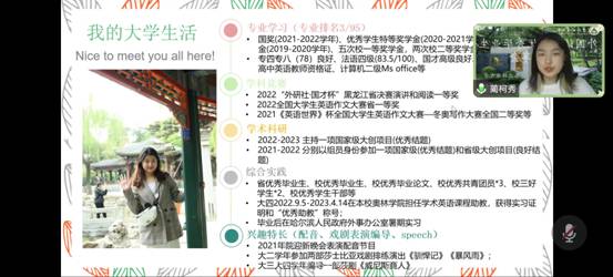 刘璐学姐向大一新生展示了她丰富的学习经验和多姿多彩的课外实践活动。古人云,“读万卷书,不如行万里路。”旅游对于刘璐学姐来说,不仅能放松心情,更能切实增强自己对社会的体验,从而提升自己的综合能力。刘璐学姐更是从学弟学妹们的角度出发,为他们提出了切实可行的建议:重视综合英语课程。这对提升新同学的基础能力来说非常重要,令人受益匪浅。
