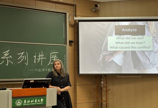 讲座由资深的外教团队主讲,他们以生活中的冲突为切入口进行了深入浅出的讲解。四位外教结合丰富的个人经历,用生动清晰的情景演绎,向在场师生分享了双方关系之间的冲突与交流,详细讲述了冲突时的情景与解决冲突的建议,并通过对眼神交流与肢体语言的分析,描述了如何建立良好的关系,如何平和的相处,让同学们更加切实全面地了解解决冲突与加强交流的重要性。